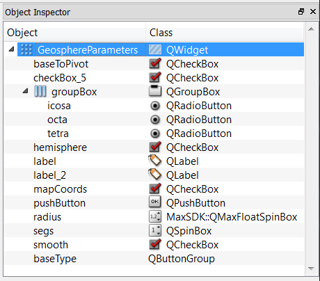 The 3ds Max SDK provides some customized Qt widgets that will work better in the Max UI. For example, the customized spin boxes will respect user decimal place settings. The headers for these widgets are located in * maxsdk\include\Qt* . Your project must link against MaxQtBridge.lib to use these widgets. To convert the Radius spinbox, right-click on it and select "Promote To..."