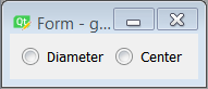 We don't need to create the title label, just the radio buttons. Add two radio buttons and select Layout in a Grid and then Adjust Size. Change the text labels to "Diameter" and "Center", and the radio button objectName properties to "diameter" and "center" respectively.