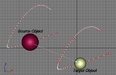 In the figure below the red sphere is the source object and it is position constrained to the yellow sphere, which is the target object. The constraint is under the special option called 'Keep Initial Offset', such that the source object doesn't jump to the target object when assigned but preserves its current position. Essentially the source object appears to be connected by a rigid rod to the target object. If the target object's position is animated through different frames, the source object faithfully follows the target on an identical trajectory - the trajectories are shown below with red lines.