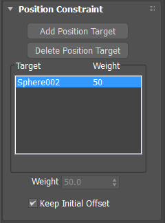 - "Keep Initial Offset" option. This option is off by default. In the default mode once the constraint is applied to a single source object, the object jumps to the to the weighted-average position of the targets and their pivot points coincide. When this option is selected the source object maintains the offset between its initial position and the initial position of the target.