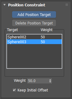 - Add Position Target: The user clicks on this button and selects one or multiple targets on the scene. The Position Constraint mode is cancelled by a right mouse click. The selected targets appear in the listbox with their default weight of 50.