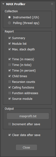 Close: This closes the 3ds Max Profiler plug-in in the user interface.