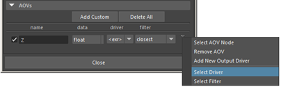 Under AOVs, to the right of the newly created 'Z' AOV, there is a downward pointing arrow. Click on that and choose Select Driver from the menu.