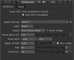 - Once you are happy with the 'focus plane', disable 'focal-plane setup'. Increase the 'depth-of-field' to one. You should now see the RGB image being blurred by the 'Zblur' node.
