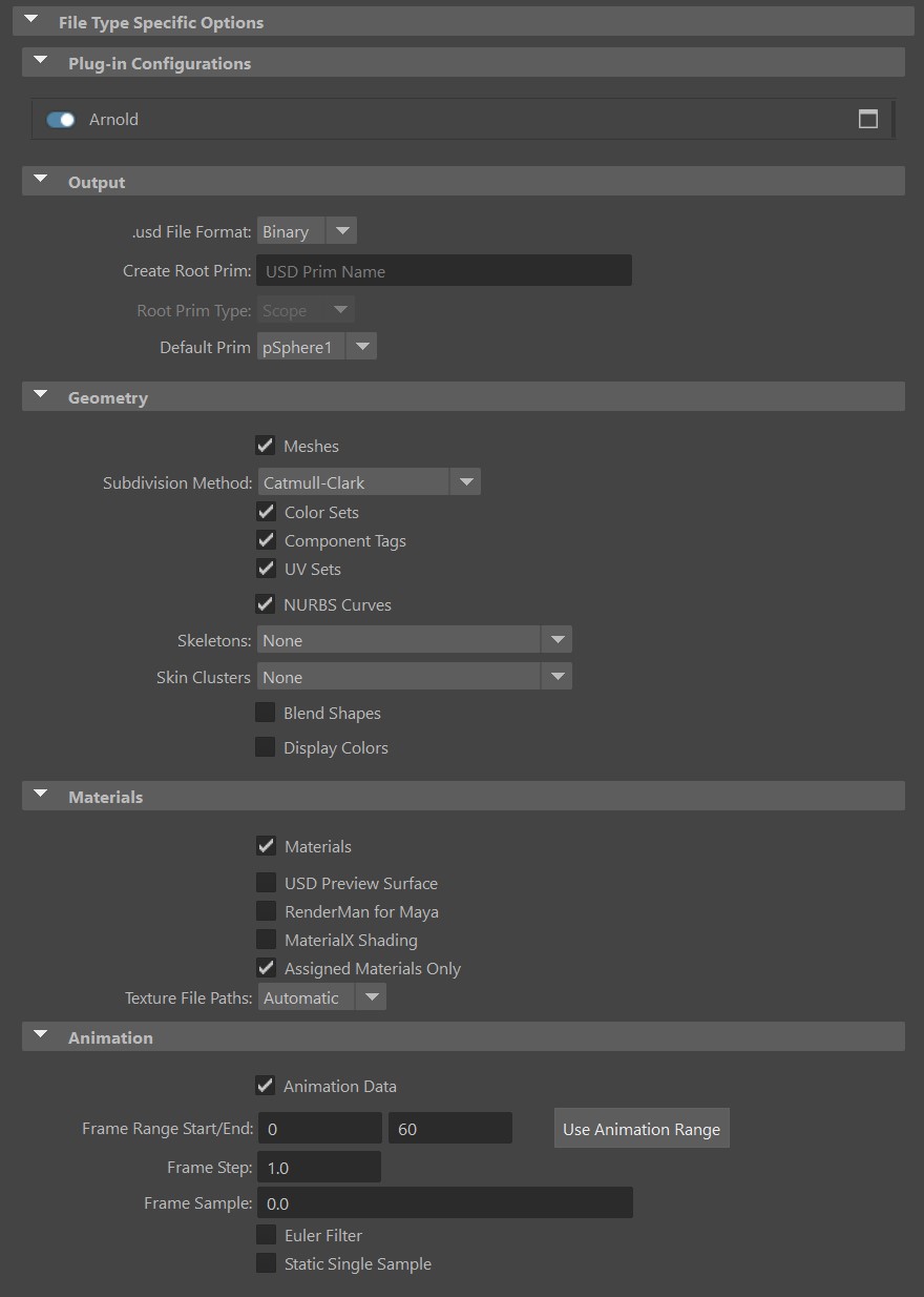 The USD export options appear when you select File > Export and choose USD Export in the Files of type drop-down menu. The following options appear under the File Type Specific Options section, letting you select what is included when you export your file. .usd , .usdc, and .usda are supported file formats for export. Exporting from Maya to USD is limited to one scene to one USD file.