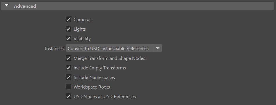 - Convert to USD Instanceable References (Default): Exports Maya instances as USD instanceable references.
