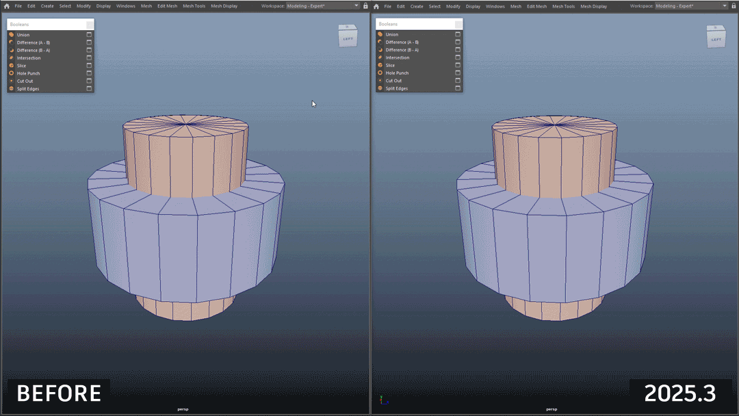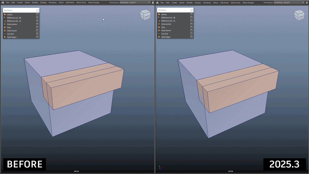 The boolean algorithm has been updated to align with 3ds Max. This enables a shared, unified core boolean engine between Maya and 3ds Max. With this update, the predictability and reliability of booleans has improved.