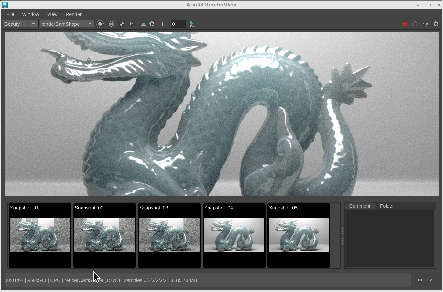 The snapshot workflow and interface in the Arnold RenderView has multiple enhancements and behaviors.