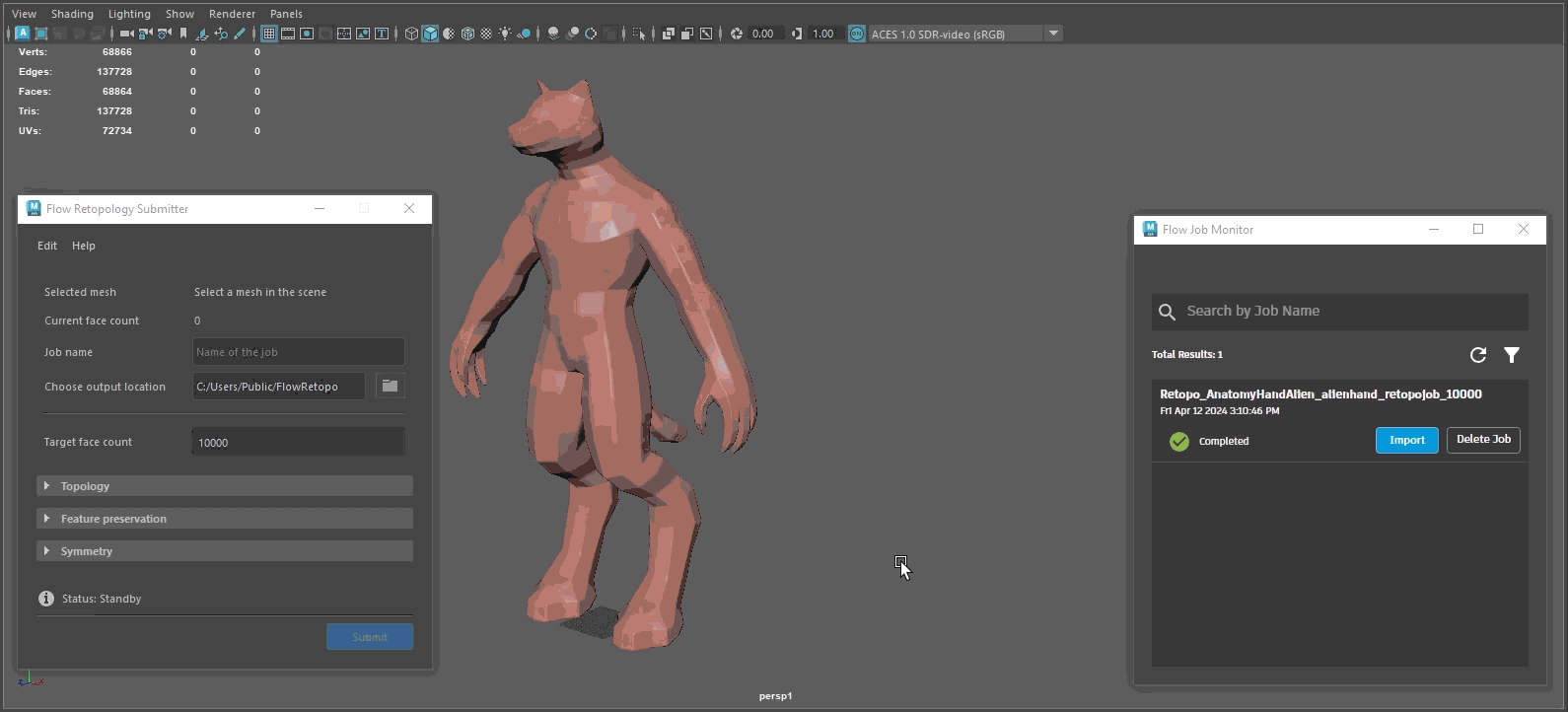 - You can choose the location on disk of where your job is stored when complete in the Flow Retopology Submitter dialog, under Choose Output Location. Navigate to the directory of your choice where your completed job will be saved on disk. Your completed job will be saved with a suffix of