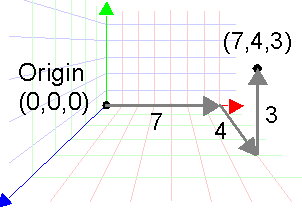 These three numbers give us the 3D coordinates of the point in space. For example, a point 7 units right (x), 4 units down (z), and 3 units above (y) the origin has the XYZ coordinates (7,4,3).