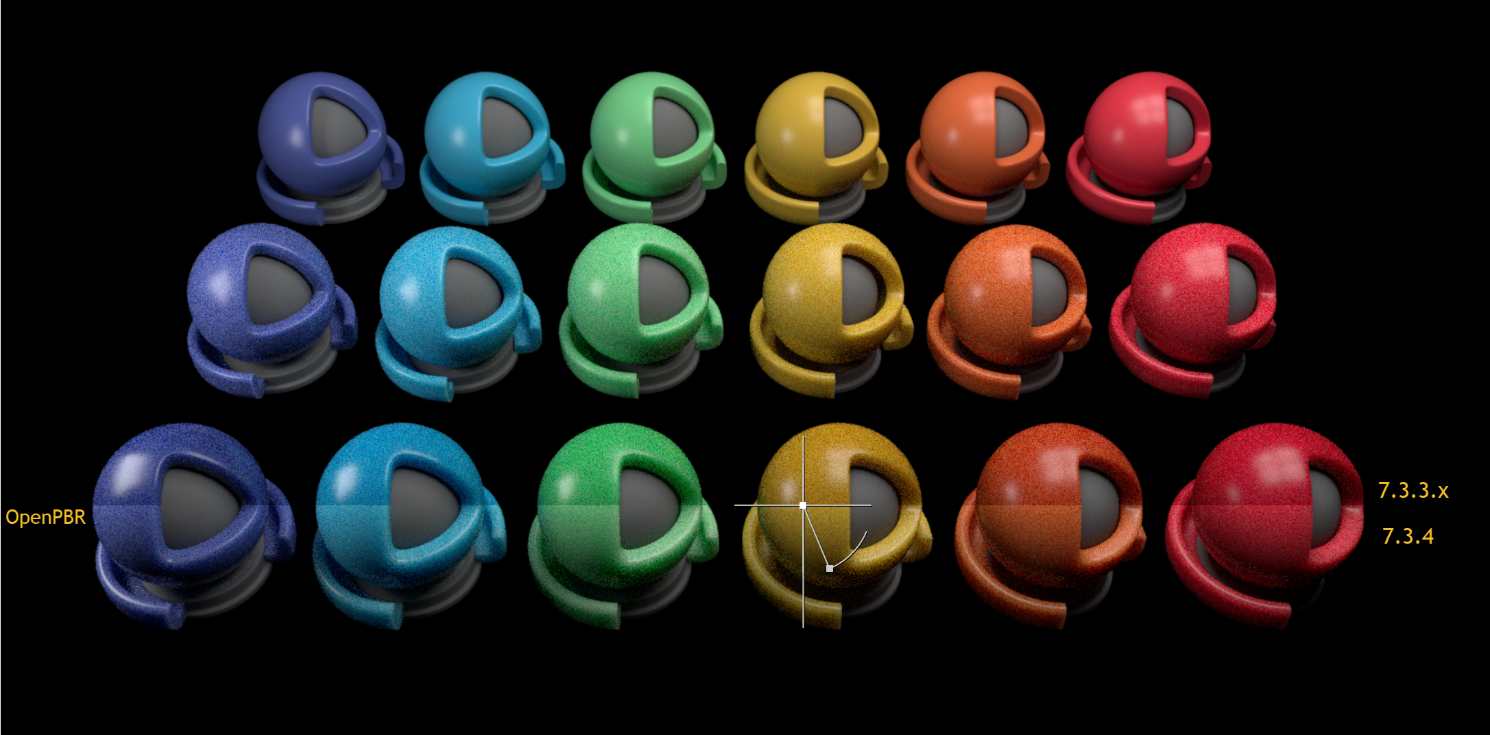 - bottom row: OpenPBR (dense) SSS, with same color assigned to