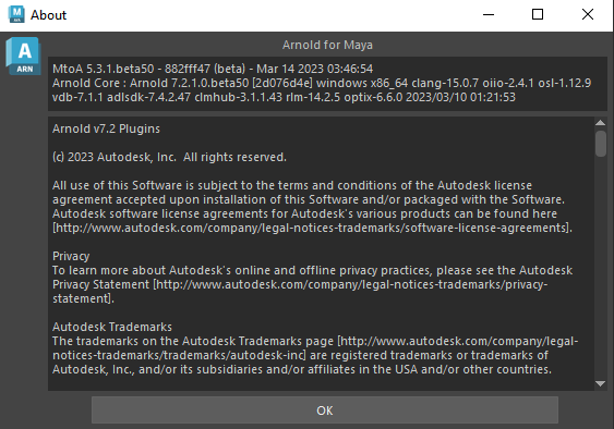You can open the About dialog from the Arnold > About menu. It displays a dialog showing credits and the version number of MtoA and the Arnold core.