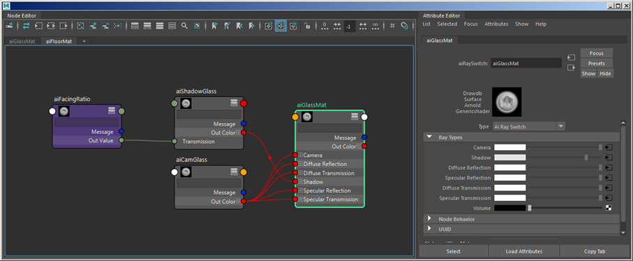 Connect the CamGlass shader output to the camera, diffuse_reflection, diffuse_transmission, specular_reflection , and transmission parameters of the GlassMat (Ray Switch) shader.