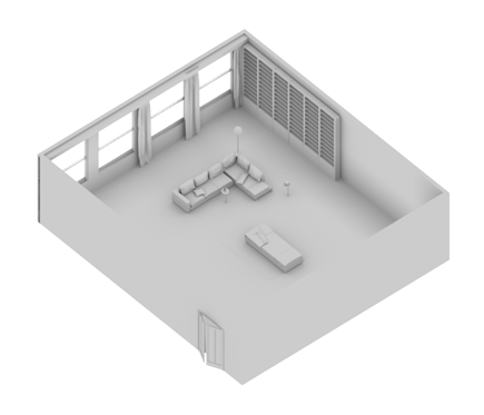 An alternative technique to lighting a room is to use Ambient Occlusion. A typical workflow is to composite the Ambient Occlusion render onto a Diffuse rendered image that does not have any GI Diffuse rays. The advantage is that it is typically faster to render and can give more creative control when compositing. You will also not need to add any GI Diffuse or GI Glossy rays to the scene. However, it is not a physically accurate method and some experience with compositing is required to fine-tune the final look.