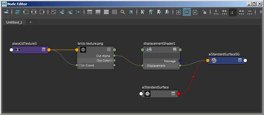 Left: Brick texture -> Displacement -> Shading Group of standard_surface shader. Right: aiImage -> Displacement (Out Color R).