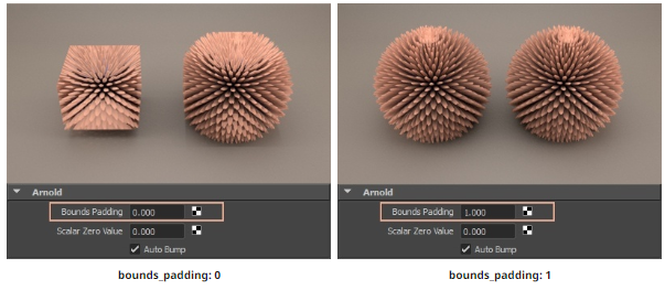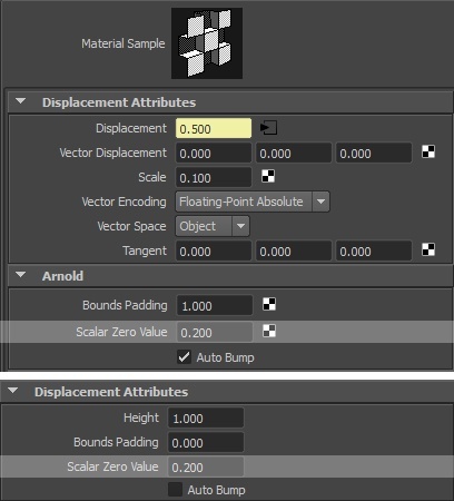 It is possible to set displacement settings on a per-face or per-object basis. However, any values that are entered in the Arnold attributes of the displacement node will override those settings. With multiple displacement shaders per object, and since an object can only have one value of bounds_padding, Arnold takes the maximum value from all of them. Autobump poses the same problem as with padding, and so Arnold enables it if at least one of the displacement shaders has it enabled.