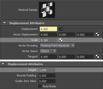 Care should be taken when using both of these attributes at the same time. The relationship between the displacement shader and the per-object mesh displacement varies when rendering. These differences are as follows: