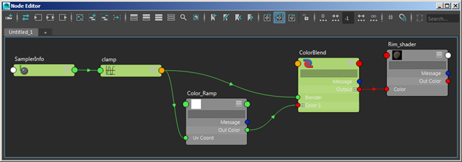 - A SamplerInfo node is connected to a ramp which determines the color of the rim light effect. This is connected to the base_color attribute of a standard_surface shader.