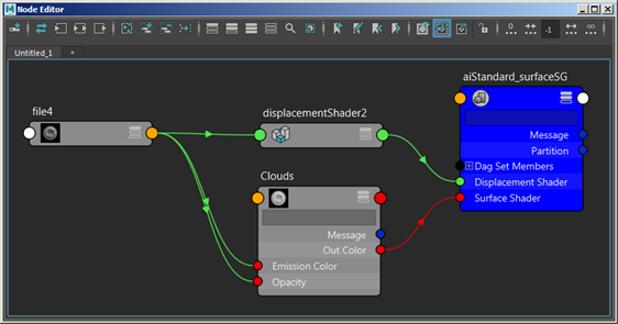 The clouds shader is a little bit simpler to setup. We will use the clouds image and connect it to the Emission, Opacity, and Displacement of a standard_surface shader.