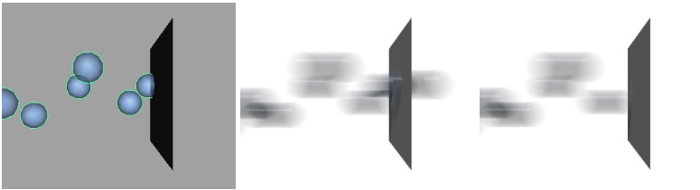 Particles maximum lifespan range reaches poly plane (left). Delete Dead Particles: Off. Motion blur exceeds particle lifespan (incorrect)(center). Delete Dead Particles: On (correct motion blur)(right).