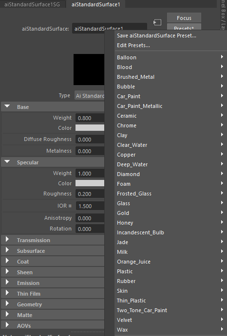 standard_surface presets available in the attribute editor