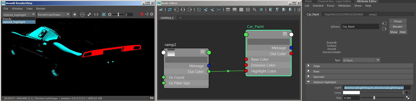Multiple (blue and red) lights used for Stylized Highlight - 'directionalLightShape1;directionalLightShape2'.