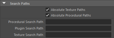 These settings specify the search paths used by MtoA to find plug-ins, procedurals, shaders, and textures.