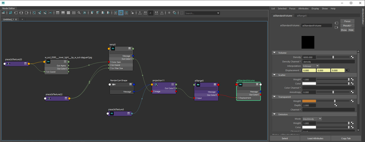 • Finally, to add some color, you could try connecting the same file texture to the scatter_color or transparent_weight attributes of the standard_volume shader.