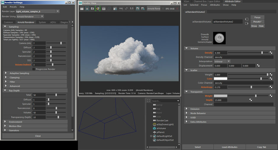 - Create a standard_volume shader and assign it to the volume. The following attributes were adjusted to give the volume the appearance of a cloud.