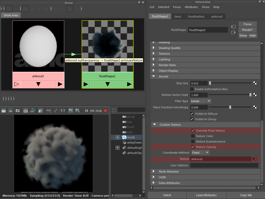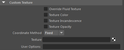 It is possible to connect texture maps to the fluid's color, incandescence, and opacity attributes (this functionality replaces the native 'Texture' attributes of Maya's fluids).