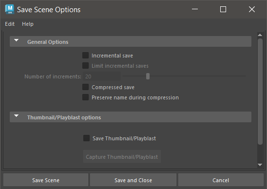 Save Thumbnail/Playblast: Select this option to be able to create a thumbnail or playblast for your scene.