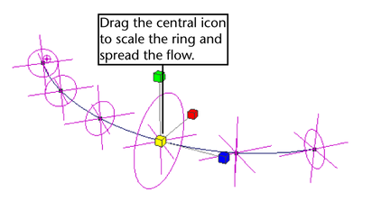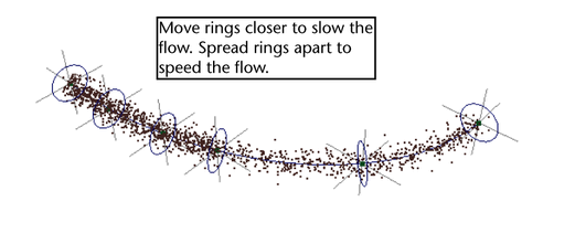 Flow locators control the speed and diameter of the flow in different parts of the curve. You can scale the flow locator rings to expand or shrink the flow diameter in that area. You can move the rings along the curve to speed or slow the flow in that area. This is useful when you’re simulating fluid flow down uneven surfaces. The flow is slower where rings are closer together. The flow is faster where rings are further apart. You can therefore space the rings to adjust the flow speed.