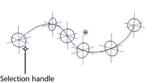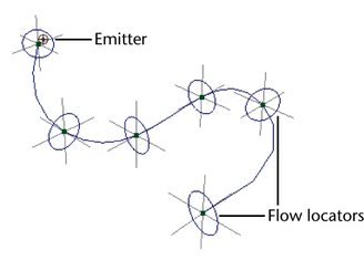 An emitter and flow locators appear on the curve. The flow locators are visual aids that show the maximum spread of the particles during animation. For details on altering the speed and spread of the particles, see Work with flow locators.