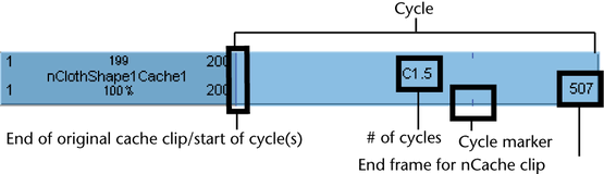 The end of the original nCache clip, and the beginning of the first cycle, is marked by a small vertical line. The end of each cycle sequence for a nCache clip is marked by a small cycle tick or marker.