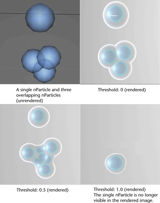 Threshold controls surface blending between Cloud or Blobby Surface spheres. Threshold is important in determining the appearance of rendered nParticles.