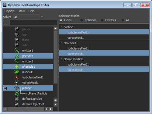 The fields that are currently connected to the particle object are displayed highlighted in the right panel under particle1. Also, the fields that can be connected to the soft body and nParticle objects are listed under pPlane1Particle and nParticle1. By default, when you select soft body objects in the left panel, the object displays in the right panel with its associated particle object appended to its object name.