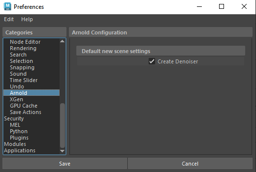 Arnold Create Denoiser option in the Maya Preferences