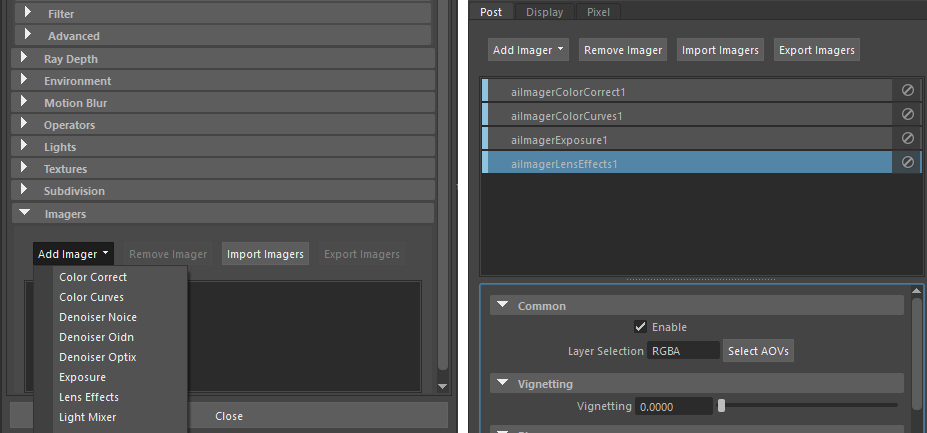 Imagers in the Render Settings (left). Imagers in the 'Post' tab in the Arnold Render View window (right).