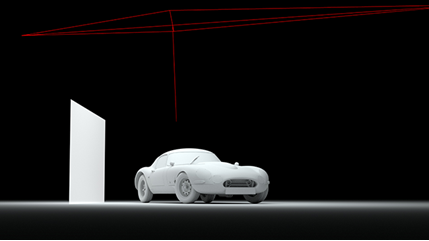 The scene is simply lit with a an area light (quad) representing large studio softbox lighting. A reflector has also been added to show reflections in the side of the car body.