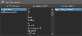 - Open the Render Settings Window and select the AOVs tab. Select Builtin in the AOV Browser. In Available AOVs, double click on indirect_specular. The new AOVs should appear under Active AOVs.