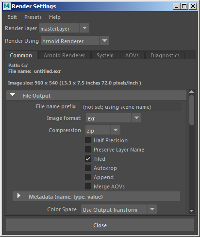 To control the file output, use the Common tab on the Render Settings Window, and expand the File Output group. The Image format control allows you to choose between the available Arnold output driver nodes.