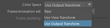 The Color Space attribute allows you to set a specific color space to output rendered images. By default, 8-bit images use the View Transform (sRGB gamma by default) through the Use View Transform option, and 16/32 bit images use the Apply Output Transform to Renderer (disabled by default) through the Use Output Transform option. The Raw option is to not apply any color transformation.