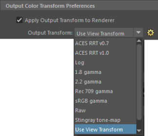 Enabling the Apply Output Transform to Renderer from the Maya Color Management preferences allows to set a dedicated color space to the renderer if Use Output Transform option was selected.