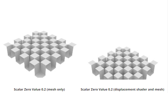 If the per-object Scalar Zero Value is increased when there is already some Displacement Scale it will have an additive effect on the displacement. For example, if the Scalar Zero Value is set to 0.2 in the shader and the per-object Scalar Zero Value is set to 0.2, the Scalar Zero Value will double in size to 0.4: