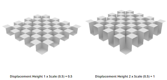 The effect of the Displacement Scale doubles from 0.1 to 0.2 when the mesh Displacement Height is set to 2.