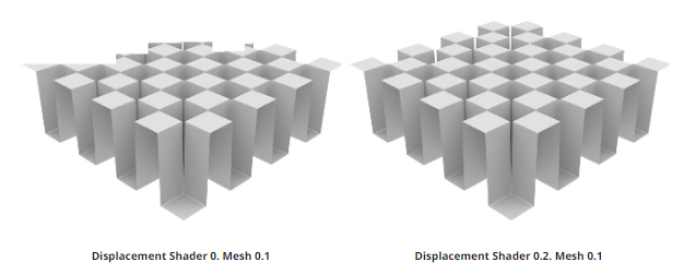 Care should be taken when using both of these attributes at the same time. The relationship between the displacement shader and the per-object mesh displacement varies when rendering. These differences are as follows: