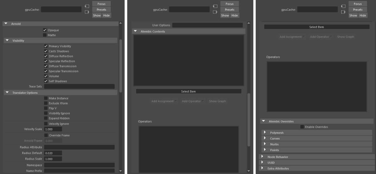Select which objects to display within the Alembic file (changes the "Geometry Path"). The list of contents gets saved to a cache attribute on the gpuCache so the .abc file doesn't need to be read all of the time.