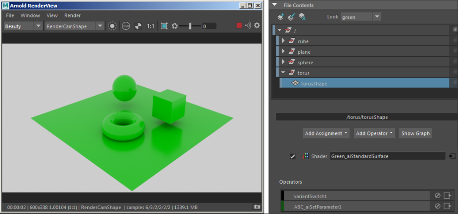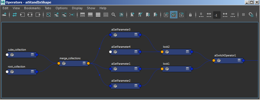 , which is connected to the root of the procedural graph. When making the first look, the current operators are moved to the first list of inputs on the variant switch node. Labels in the aiLookSwitch are used to populate the menu from the aiStandIn. This plug can be set/overrode by the Render Setup tools for adding different looks per layer/pass. The name/ look /pass will get translated to an index number for rendering.