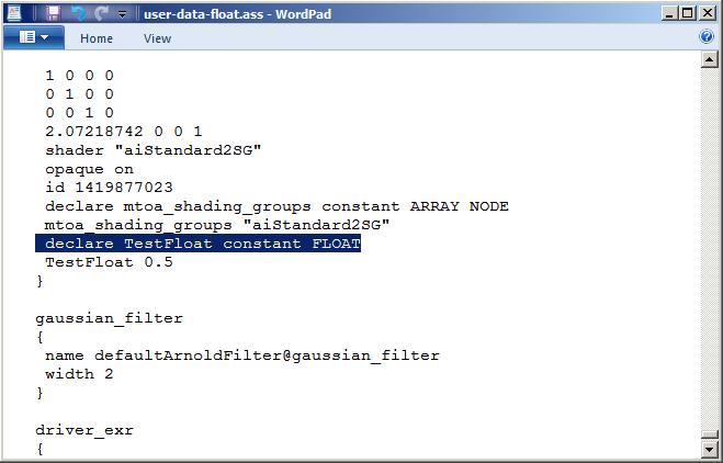 - Export the scene as a .ass file and open it in a text editor. We can see that the float TestFloat is stored in the .ass file as follows:
