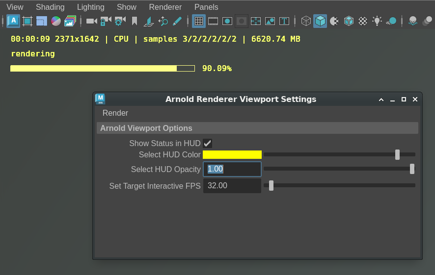 • Opacity and Interactive FPS added to the Arnold Viewport HUD: In the Arnold Renderer Viewport Settings, you can now set the opacity of the HUD, and control the target interactive FPS for updates. (MTOA-2524)